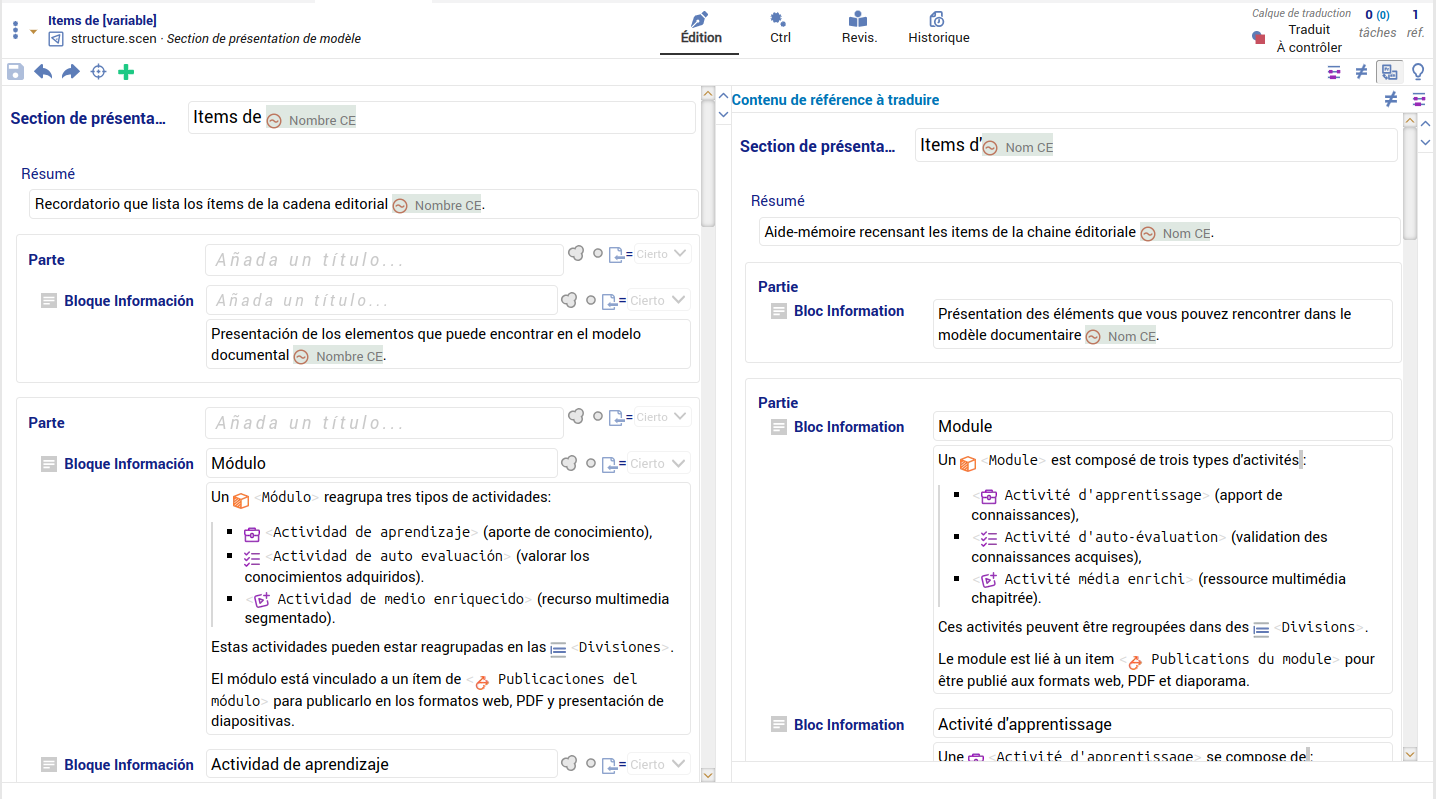 Avec un navigateur compatible édition web Scenari (Chrome, Chromium, Edge, Opera, Brave, Vivaldi), ouvrez dans une fenêtre l'atelier de traduction vers l'espagnol des mini-sites de présentation.