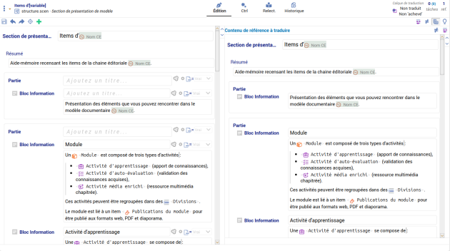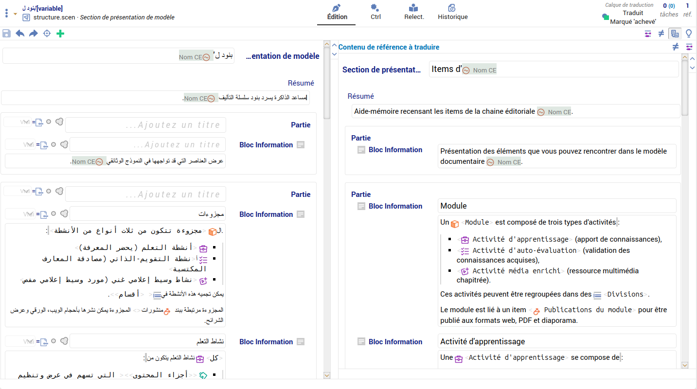 Avec un navigateur compatible édition web Scenari (Chrome, Chromium, Edge, Opera, Brave, Vivaldi), ouvrez dans une fenêtre l'atelier de traduction vers l'arabe des mini-sites de présentation.